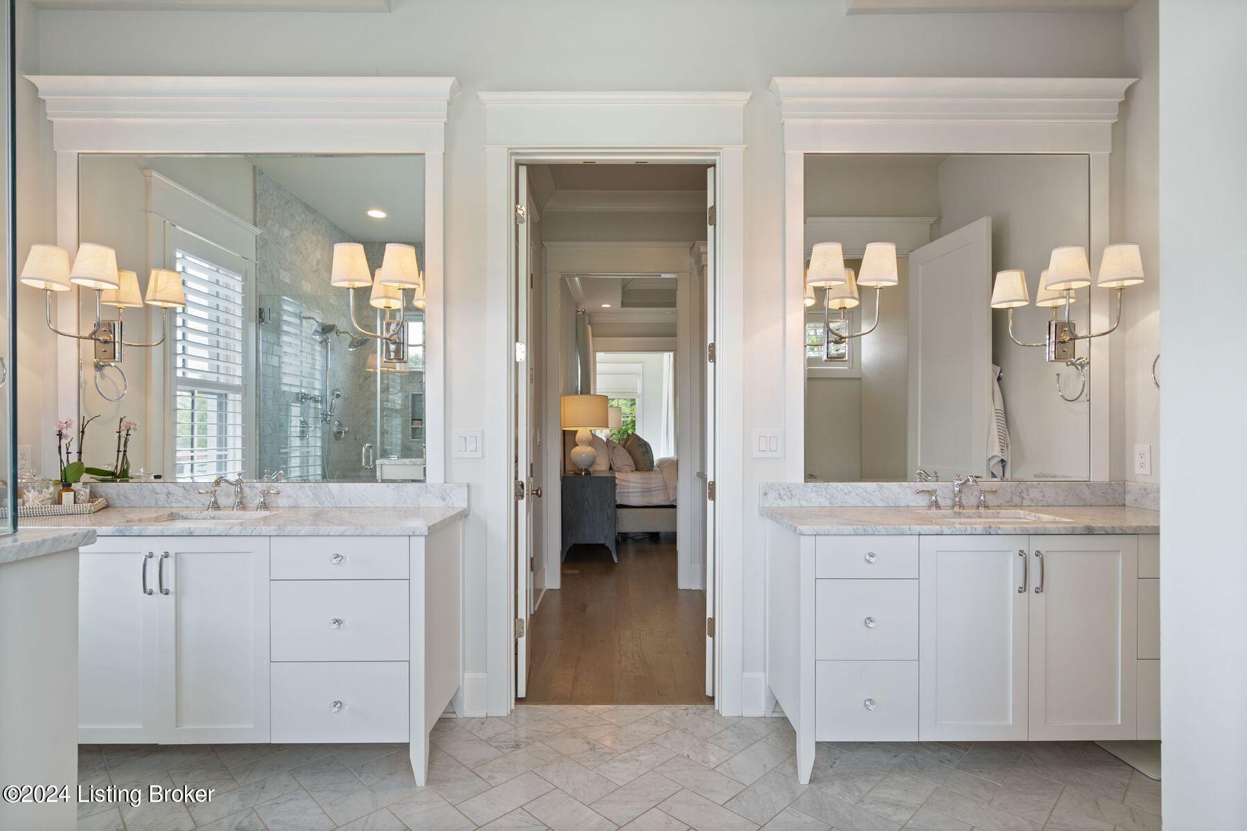Introducing the coveted People's Choice Homearama winner of Poplar Woods, this stunning executive ranch offers a custom-built masterpiece designed to transcend time, finding the perfect balance between warmth and refinement. Nestled on a premier, flat lot with wooded views within the 100+ acre conservation development, this timeless estate home offers the opportunity to own like-new construction without the premium cost or lengthy build process, allowing homeowners to immediately begin taking advantage of the award-winning North Oldham County school district and nearby amenities. Featuring nearly 5,700 finished square feet, covered porch with outdoor kitchen and fireplace, and spacious patio with sunken hot tub and fire pit, this exceptional 5-bedroom home offers an unprecedented level of finish and scale for the neighborhood. Past manicured landscaping and arched covered porch, guests first arrive into the bright foyer with French door entry, shiplap detail, and light hardwood floors that continue throughout the first floor. A handsome study sits off the foyer with wainscoting, picture window, and built-in bookshelves. The first floor's open floor plan invites guests further into the spacious great room of the home with soaring coffered ceiling, stone fireplace, and sliding doors that effortlessly blend living spaces between the outdoor entertaining areas and interior home. Overlooking the rolling lawn and mature trees, the great room opens into the gourmet eat-in kitchen and dining room of the home, defined by bright open spaces, welcoming natural light, and a massive marble island. The spacious gourmet kitchen features Thermador stainless steel appliances, gas range with convenient pot-filler, Century floor-to-ceiling custom cabinetry, marble countertops, and pantry. Off the kitchen, the spacious dining area offers an inviting gathering area with access to the home's incredible covered porch and outdoor kitchen, making entertaining effortless. The opposite wing of the home features the stunning primary suite with spacious bedroom with vaulted tray ceiling, windowed sitting room with access to the home's covered porch, and resort-inspired wet bar area with beverage cooler. The suite is complete with a designer primary bathroom embellished with Carrera Marble, dual vanities, soaking tub, oversize shower, and spacious custom walk-in closets. The first floor continues with a custom drop-zone area accented with shiplap walls, perfect for organizing after-school activities or a quiet study space, and flanked by two spacious guest suites with en-suite baths and walk-in closets. The first floor is complete with a stylish powder room, oversized laundry room with sink and storage, and attached 3-car garage with epoxy finish and wall-mounted storage. Designed for spending time with family and friends, the fully finished lower level mimics a second first floor with bright open spaces, sleek hardwood floors, and upgraded selections to create a one-of-a-kind gathering space. The lower level features a large sitting room, billiards room, family room with tray ceiling and projector, and fully-equipped wet bar with honed granite countertops, custom cabinetry, and full-size stainless steel appliances. The lower level continues with an oversize exercise room, bedroom with walk-in closet and adjoining full bath, additional guest bedroom with en-suite bath and walk-in closet, and plenty of room for additional storage. The home's exterior offers an unbelievable retreat for homeowners, with thoughtful additions like outdoor fireplace, porch ceiling heaters, and motorized retractable screens to create a stunning space truly usable anytime of the year. From the gourmet outdoor kitchen to the sunken hot-tub overlooking the scenic backyard, guests will be impressed at first sight with this incredible space. Conveniently located just minutes from North Oldham's schools, Creasey Mahan Nature Preserve and Park, Hermitage Farm's renowned Barn8 restaurant, Francis Parker's Goshen campus, and the restaurants, businesses, and expressways of Prospect, this home is not to be missed.
